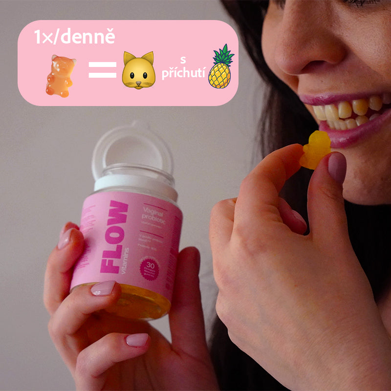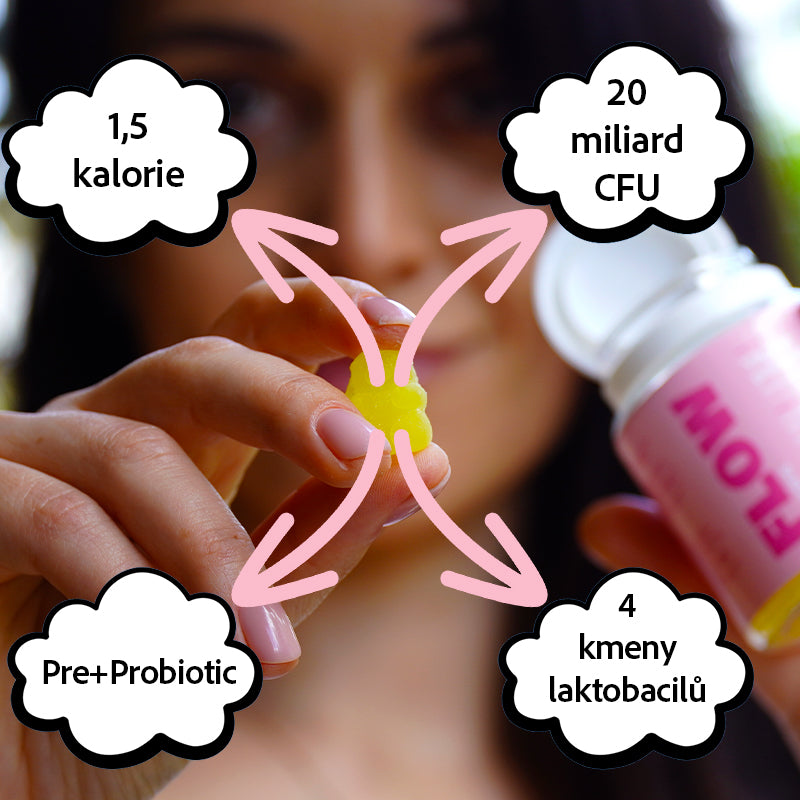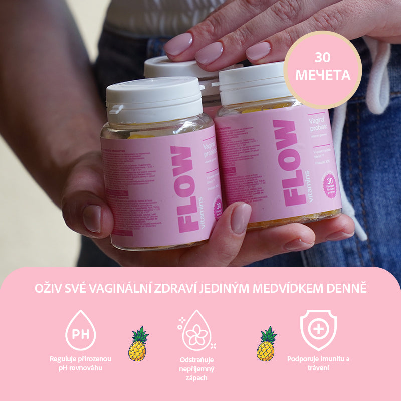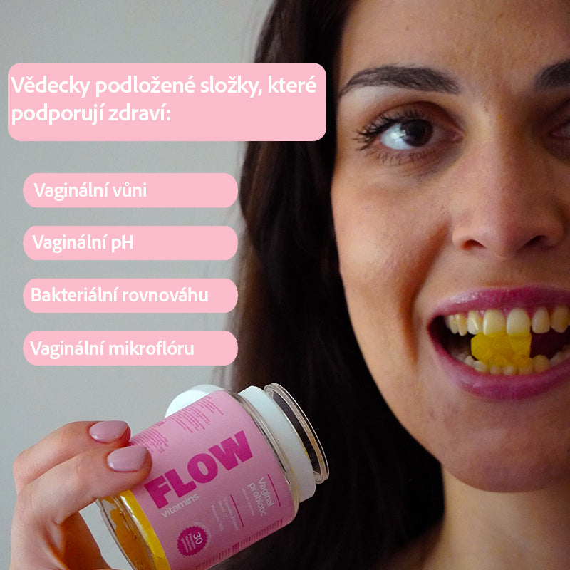 FLOW je přírodní, patentovaný synbiotický doplněk stravy pro vaginální zdraví (což znamená, že obsahuje prebiotika i probiotika) vyvinutý pro podporu zdravého pH, zápachu, rovnováhy kvasinek a flóry pochvy.